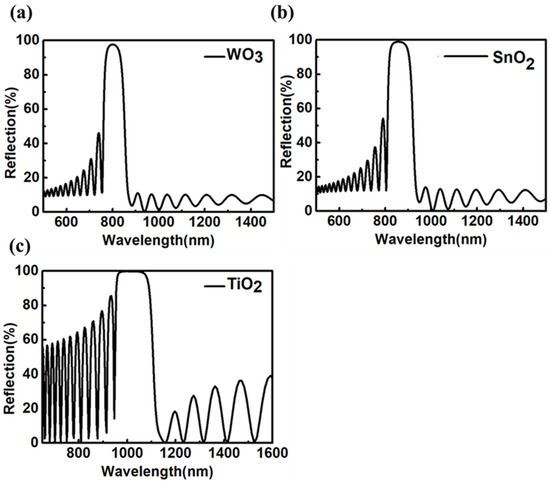 Figure 9 shows the calculated reflectance spectra of higher refractive index-contrast IO systems after response to water, where the absolute refractive index contrast of these IO systems composed of WO