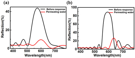 Figure 7, it can be easily found that the IO systems with higher absolute refractive index contrast (1.02~1.71) show higher intensity of the reflection peak (95–100%) after responding to water, which is much higher than the peak intensity (30%) of IO structures consisting of PEGDA matrix after a response. This indicates that the IO systems with higher absolute refractive index contrasts show higher color brightness after response. However, it does not mean that the IO structure composed of PEGDA and air has lower color brightness after responding to water, since the intensity of the reflection peak is not only related to the absolute refractive index contrast but also related to the structure thickness.
