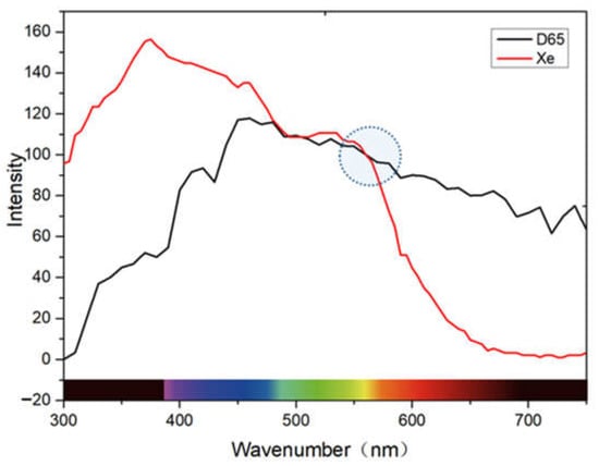 Relative spectral power distribution of Xe lamps and D65 light sources.