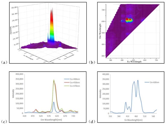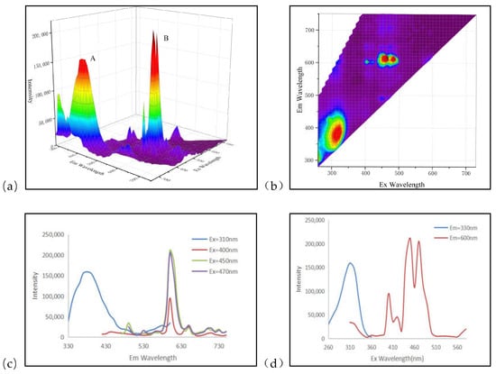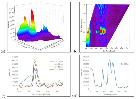 Since the relative fluorescence intensity of the B-1 sample in the ultraviolet region is significantly higher than that of other regions, the emission peak of the orange–red region of the sample cannot be visually observed in Figure 6a,b, we narrowed the excitation wavelength range to highlight the emission peaks in the orange–red region (Figure 7a,b). Combined with the fluorescence matrix data to make a three-dimensional projection (Figure 7a) and contour line (Figure 7b), we fixed Ex = 320, 400, 450, 470 nm and Em = 600 nm then found two characteristics of these fluorescence peaks: (1) The sample has emission peaks at 400, 450, and 470 nm are consistent with the other samples, with the corresponding emission wavelengths concentrated around 600 nm; (2) Different from the previous two, this sample emits orange–red fluorescence at an excitation of Ex = 320 nm and has twice the intensity of the A-peak group of BG-1. This also explains the mixed violet–red fluorescence color of the B-1 sample due to the intense violet region luminescence demonstrated in Figure 6. (Figure 6 and Figure 7 are drawn according to the Tables S7–S9).