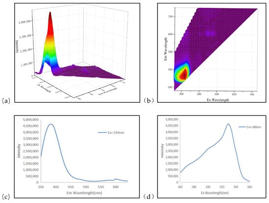 The result of the 3D fluorescence matrix of B-1 is shown in Figure 6a, and the contour map is shown in Figure 6b. The B-1 sample has a very strong emission peak in the UV region and its fluorescence intensity is much higher than the first two samples. Fixing Ex = 330 nm and Em = 380 nm, the peak position shows strong excitation in the violet-UV region, with FWHM = 65.9 nm for the emission peak and FWHM = 46.6 nm for the excitation peak (Figure 6c,d).