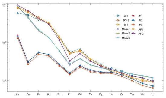 Normalized rare-earth element distribution map of apatite. Chondrite values come from McDonough and Sun (1995) [].