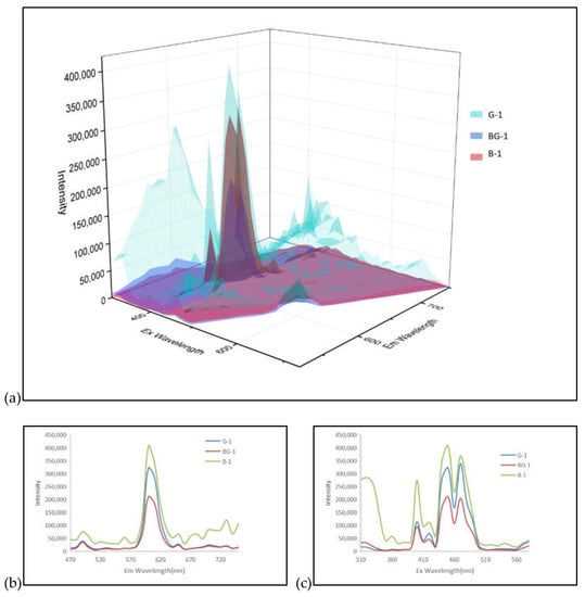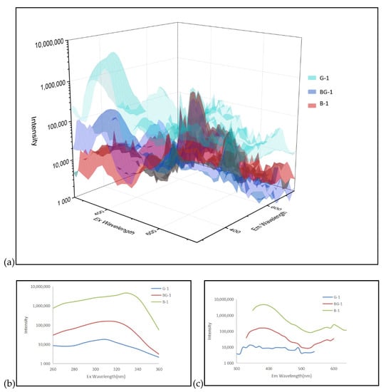 We fit the 3D fluorescence matrix data of G-1, BG-1, and B-1 to observe the difference in peak intensity between samples more intuitively. The logarithm of the ordinate is shown in Figure 9a, and the strongest emission peak of each sample in the ultraviolet region is fitted to make the emission spectrum (Figure 9b) and the excitation spectrum (Figure 9c). With the transition from bluish-green to greenish-blue, the relative intensity of the strongest fluorescence peak in the ultraviolet region of the sample shows an obvious multiple difference.