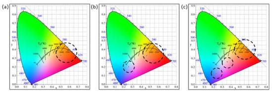 As shown in Table 4 and Figure 11c, under the excitation of 330 nm, the color coordinates of B-1 are in the purple region, the dominant wavelength is 406 nm, and the color range of the CIE1931 chromaticity diagram is determined as purplish blue; the color coordinate under excitation at 400 nm is close to the coordinate of the D65 light source, the excitation purity is relatively low, and the color is purplish pink. Since the coordinates are in the purple–red region without the dominant wavelength, only the complementary color wavelength is 529 nm (that is, the spectral color at the dominant wavelength of 529 nm mixed with the coordinate color can match the reference white point of the D65 light source). The color coordinates under excitation at 450 nm and 470 nm are similar to those of the G-1 and BG-1 apatite samples, but the excitement purity is the lowest of the three.