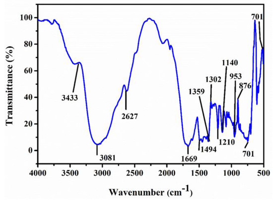 The data regarding the structure of a material are evident from this spectroscopic analysis. The absorption of IR radiation leads to diverse peaks in a particle, showing stretching and bending vibration as represented in Figure 2. A strong broad absorption in the range of 3300–2300 cm−1 agrees with the NH3+ of the amino group [18]. The strong edge at 3081 cm−1 is C-H stretching. Overtone combination appears in the absorption region at 2090 cm−1. The peaks at 1302, 1359 cm−1 exhibit CH2 wagging and CH2 deformation [19,20]. The wavenumber positioned at 1210 cm−1 is C-CH in a sharp bending vibration. C-C and C-N stretching are identifiable in wavenumbers 1140, 1183 cm−1 [18]. The vibration of C-H out of plane (bending) initiates peaks at 953 and 914 cm−1. The wavenumber at 701 cm−1 exhibits the presence of a benzene ring. Thus, peaks which appear at 853 cm−1, 748 cm−1 establish C-H (out of) plane deformation [17].