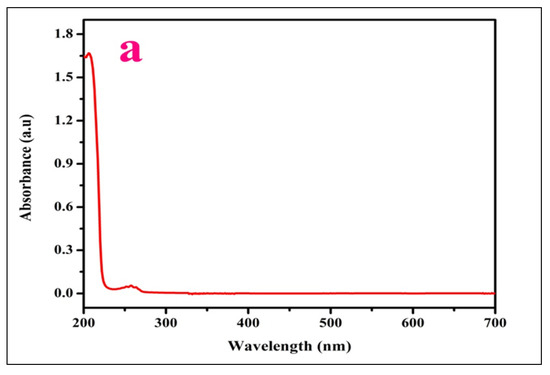 The optical spectrum of LPPMA was established in the 200–700 nm wavelength range. From the UV-visible spectrum (Figure 3a), it is clear that ultraviolet absorption includes electronic transitions from an unexcited state to an excited one [21]. The lower cutoff wavelength of LPPMA at 233 nm with extremely good transparency proves its applicability in second and third harmonic generation. The absorption coefficient (α) was assessed utilizing the following Formula