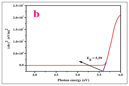 where A symbolizes the constant and Eg, h and v represent the energy gap, the value of the Planck constant (6.63 × 10−34 Jsec), and frequency of photons. The energy gap Eg of LPPMA was estimated using Tauc’s plot (Figure 3b) and its value is 5.58 eV. Thus, the organic LPPMA crystal with an enhanced optical band gap is a potential aspirant in the field of nonlinear optics.