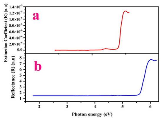 Figure 4a,b, depict that R and K fully rely on incident photon energy [21]. Figure 4c,d depicts (R) and (K) versus the absorption coefficient (α). The device internal efficacy mainly relies on this absorption coefficient (α) [21]. Figure 4e displays the dependence of linear n0 (refractive index) versus incident energy (photon). The minimum value of n0 highlights that LPPMA has a regular dispersion nature. The high optical transparency of LPPMA in the Ultraviolet-visible section illustrates it as a good optical behavior candidate for use in device applications.