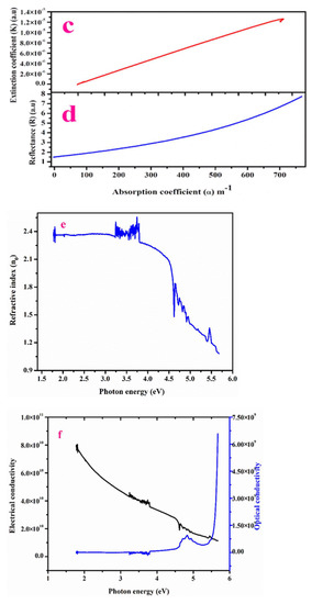 Figure 4e describes the elevation of optical conductivity with the increase in hυ, for which a large value confirms the elevated photo-tunable feature of crystal [4]. Figure 4f concludes that the value of electrical and optical conductivity depends on the photon energy. Hence, this potential material is suitable in the ultrafast data transmission process (optical) [21].