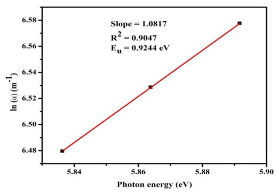The slope is 1.0817. Figure 5 illustrates the logarithm of (α) with the incident energy of the photon (hυ). The inverse of the linear plot measures the Urbach energy (Eu), which was evaluated as 0.9244 eV. The lower calculated value of Eu indicates less flaws in LPPMA which validates its usage in nonlinear optics.