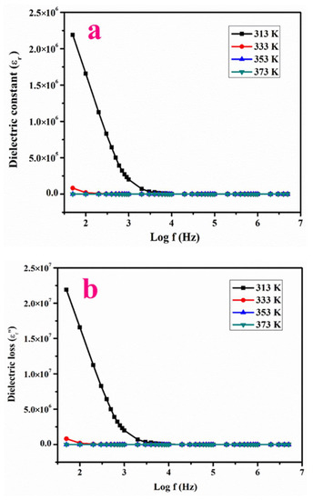 Here, C represents the capacitance specified by micro farad, t the thickness specified in mm, ε0 is the dielectric constant in vacuum (ε0 = 8.854 × 10−12 Fm−1) and A indicates the area of the testing material in mm2. Figure 7a,b shows variations of ε′ and ε″ with log frequency and it reduces with a rise in frequency. The higher values of ε′ at smaller frequencies is a result of all polarization mechanisms. The lower range of (ε′) at the domain of a higher range of frequency may possibly originate with respect to the electric field applied [26]. The lower measure of ε′ and ε″ at a high frequency range indicates the enhanced optical nature with the minimal amount of defects in LPPMA, which furthermore fulfills the requirements for use in the opto-electronic sector and in nonlinear optical devices [26].