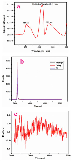 The luminescence spectrum of LPPMA was measured to emphasize its emission nature and its spectra are presented in Figure 8a, using a wavelength of excitation of 233 nm. The highest peak in emission occurred at 535 nm (2.31 eV), in the visible range spectrum. The peaks at 454 nm (2.73 eV) and 511 nm (2.42 eV) were attributed to defects existing in the material.
