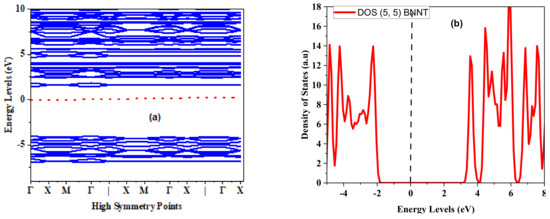 Computational condensed matter physics used DFT simulations to obtain the electronic and optical properties of both the bulk and nano-forms of materials with all configurations. It explained the correlated relationship between the optical bandgap and electronic bandgap of materials, as can be viewed in the ultraviolet region of the EM spectrum. As presented in Figure 1a, highly non-metallic properties can be observed from (5, 5) SWBNNT, which demonstrates a bandgap of 5.4 eV (Figure 1b); this value falls within the range of the bandgap obtained for BNNTs [18] as reported in ref. [19]. There are also more energy states in the conduction band than in the valence band for the (5, 5) SWBNNT system. The electronic bands and density of the states were also calculated for the (5, 5) SWCNT system, and zero bandgap can be seen with bands crossing the Fermi level and intersecting at the Dirac point as presented in Figure 2a. A justification is that the (5, 5) SWCNT system is metallic, as are other armchair CNTs [20]. In contrast to BNNTs, more energy states appear in the valence band than in the conduction band (Figure 2b), and the density of the state revealed three different sub-bands forming both inter-band and intra-band optical transitions (Figure 2b). There is therefore strong optical absorption as the energy of the incident photon equalizes the corresponding sub-bands [21]. In each case, there is a specific sub-band that has been identified by one integer that denotes the size of the sub-band. Three optical band gaps that are parallel to the direction of the tube axis are seen. Optical absorption occurs when the difference in sub-band energies equals the energy of the incident photon. There is a strong correlation between the chirality of the (5, 5) SWCNT and its optical transitions. This is because as the diameter of the (5, 5) SWCNT increases, there occurs a shift in the absorption peaks to greater photon energies [22].