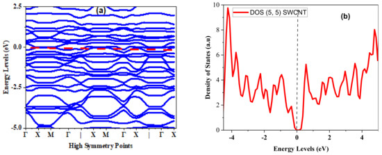 (a) The electronic bands and (b) density of the states of (5, 5) SWCNTs.
