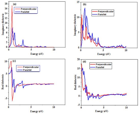 As presented in Figure 3a, the optical gap of the (5, 5) SWCNT in the imaginary dielectric was larger in the parallel direction than in the perpendicular direction; as such, the dielectric function of (5, 5) SWCNT was anisotropic [26,27]. Furthermore, the dielectric function for the z-direction was higher than in the x-direction in the majority of the energy ranges. The presence of peaks in the imaginary part of the dielectric function indicated the occurrence of inter-band transitions [28]. In the case of the (5, 5) SWBNNT, the optical gap was larger in the perpendicular direction than in the parallel direction; three smaller peaks can be seen in the parallel direction for (5, 5) SWBNNT, and this demonstrates that BNNTs can also be anisotropic [29].