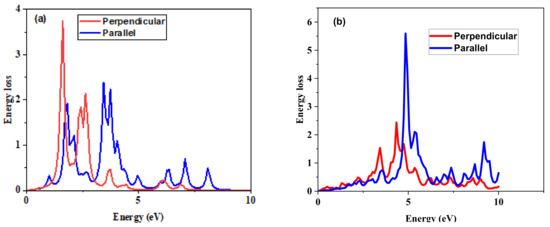 The energy lost/released by an electron in traversing from one band to another was calculated for both (5, 5) SWCNT and SWBNNT systems. The calculated charge distributions of each of the two nanotubes are presented in Figure 4. In all cases, the peaks of (𝜔) appeared as a result of combined excitations of different photons with various frequencies. The expanded distance of the electron energy loss by the excitons in (5, 5) SWBNNT (Figure 4a) related to the absorption peak [30]. This shows that the distribution of the valence electrons has fast convergence. More energies were lost in the perpendicular direction than in the parallel direction for (5 5) SWBNNT; this can be seen by the appearance of peaks at 2.0 eV, which correspond to the energy in the plasma frequency and 2.7 eV (red) respectively. Therefore, the maximum energy was lost as a result of the effect of incident electromagnetic radiation with matter. In the (5, 5) SWCNT structure, the maximum energy loss was in the parallel direction rather than in the perpendicular direction; this can be seen from the peak at 5.0 eV presented in Figure 4b. This value is also associated with plasma energy. Furthermore, the charge distributions were more in the direction parallel to the (5, 5) SWBNNT tube axis. Sharp π-electronic peaks [31] were seen parallel and perpendicular to the tube axis, as shown in Figure 4a. Plasmon peaks were seen at 4.5 eV and 5.2 eV parallel and perpendicular to the tube axis, respectively. These results indicate that the energy loss variations had the same amplitude in (5, 5) SWCNT. The energy loss region of the EELS in Figure 4a,b is generally less than 50 eV; this is specifically called the valence electron energy loss spectroscopy (VEELS) because it is dominated by the collective excitations of the Plasmon (valence electrons) and inter-band transitions [32].