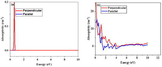 Figure 6 shows the region of low range and high range energies. The peaks in the low range energy appear because of the total intra-band excitations to the empty conduction states from the occupied valence states. The corresponding valence-to-conduction band transition can be seen from the peaks in the z-direction absorption spectra. The spectrum of SWBNNT presented in Figure 6a shows only one peak, which occurred at 0.7 eV in the perpendicular direction. This peak was a result of transitions between optical-electronic states [34]. Zero peaks can be seen in the parallel direction, which justifies zero absorption. The presence of a peak at 0.7 eV shows that SWBNNT only absorbed photons in the ultraviolet region, and there was no absorption in the visible region; therefore, (5, 5) SWBNNT was regarded as the poor absorber of photons in the visible region.