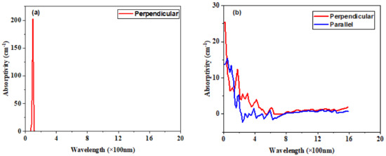 It can be seen that armchair SWBNNT showed high absorption perpendicular to the nanotube axis only. This occurred at the wavelength range of 100 nm (see Figure 7a), which corresponded to the range of wavelength in the UV region (100–400 nm) [35]. As such, armchair SWBNNT demonstrates high absorption in the ultraviolet region. Similar analyses were carried out on armchair SWCNT, as shown in Figure 7b. In this case, (5, 5) SWCNT demonstrated high absorption in all directions in the same ultraviolet region as SWBNNT. The combined absorption properties of these nanomaterials in the ultraviolet region revealed that they can be used as impurity detectors. The similarities observed in Figure 6a,b and Figure 7a,b confirmed that electromagnetic energy is a function of wavelength.