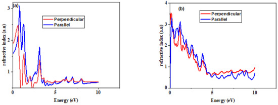 The optical refractive index of (a) armchair (5, 5) SWBNNT and (b) armchair (5, 5) SWCNT structures.