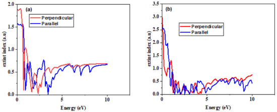 where n is the index of refraction and k is the extinction coefficient in the real and imaginary parts, respectively, of the complex refractive index. As presented in Figure 8a, higher refractions were found parallel to the (5, 5) SWBNNT axis than the perpendicular axis; however, the extinction of refraction, which is a function of the imaginary dielectric, was higher perpendicular to the nanotube axis. Figure 8b showed that 0.1 eV was obtained for maximum optical extinction, and 2.0 eV was obtained for optical refraction, which confirms the dielectric function. Refraction was seen both parallel and perpendicular to the tube axis. The ability of (5, 5) SWCNT to refract in all directions brings it to be a potential candidate for fiber optics and magnifying lenses [35]. Our results are comparable to the results obtained for (10, 10) armchair SWCNT [36]. The coefficient of extinction is the amount of energy loss as a result of charge interactions between medium and light. We studied this to understand the number of transmissions across refracting systems, which we achieved by taking measurements of the photon frequency transmitted through SWBNNT and SWCNT as a function of energy. Figure 9a,b reveals that there was perfect transmission in all directions, and for all the SWBNNT and SWCNT structures studied, this occurred in the energy range below 1 eV.