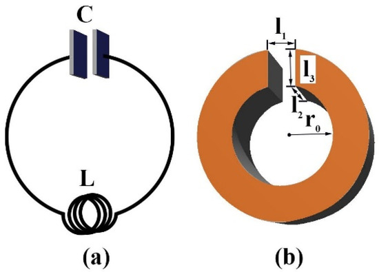 In Figure 1, the positive and negative domains of the MPPC are arranged periodically along the x-axis. We denote a and b as the thicknesses of positive and negative domains, respectively. Then, the period of domains is Λ = a + b, and the duty cycle is r = a/b. The thickness of the MPPC is b0 along the x-axis. The SRRs are installed on the opposite sides of the MPPC along the x-axis, and the gap directions of the SRRs are identical. The SRR can be described as an equivalent LC oscillator with the capacitance C of the SRR gap, a practical inductance L, and resistance R [28]. Figure 2a,b show the comparison of an equivalent LC circuit and a metallic SRR; the parameters of SRR are marked in Figure 2b: the gap size l1, the thickness l2, and the width l3, radius r0 [29]. The bottom arrow indicates that a y-polarized EM wave propagates through MPPC along the z-axis. According to Faraday’s law of electromagnetic induction, currents can be induced by the magnetic field of the EM wave in the SRRs. This result in an attractive Ampère force between the SRRs, and MPPC is compressed periodically by the Ampère forces acting between the SRRs. For identical rings sharing a common axis and carrying currents, the force acting between them has only the axial component, calculated as [30]
