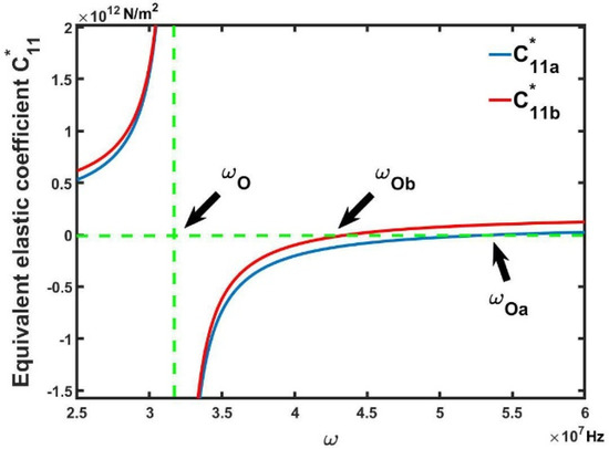 From the above results, Mg ion concentrations of the positive and negative domains in the MPPC of 0 mol% and 7 mol% were chosen in order to increase the difference between elastic coefficients. By use of Equations (24) and (25), the first-order equivalent elastic coefficients and (n = 1) of the positive and negative domains in the MPPC are plotted in Figure 3. Because the damping of the material is not considered, Figure 3 only shows the real parts of the equivalent elastic coefficients, and and are represented by the blue and red lines, respectively. In this paper, the material parameters of the positive domain in the MPPC are chosen from Ref. [31]: = 2.03 × 1011 N/m2, = 2.50 C/m2, = 4.700 × 103 kg/m3, = 44.00. The proper values of the material parameters of the negative domain in the MPPC are chosen as follows [26,27,36,37,38]: = 3.00 × 1011 N/m2, = 2.32 C/m2, = 4.630 × 103 kg/m3, = 20.00. The other parametersinclude: the period Λ = 2 × 10−5 m, the number of the period N = 20, the duty cycle r = a/b = 3, m = 1, r0 = 5.00 × 10−3 m, S0 = 7.85 × 10−5 m2, S = 1.00 × 10−4 m2, the suitable values of the complete elliptic integrals of the first K and second kind E are chosen from Refs. [39,40,41]