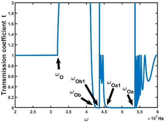 Now, let us address their influence on the transmission properties of the sound waves in the MPPC. We know that the elastic coefficient plays an important role in the computing of the Transfer Matrix. Therefore, the two elastic anomalies can influence the transmission spectrum, which was computed by using the Transfer Matrix. From Equation (26), the transmission coefficient t is plotted in Figure 4. The physical origin of Equation (26) can be understood at the micro-scale from the classical wave theory to describe the Bragg resonances, based on the scattering of mechanical waves propagating within the phononic crystal [43].