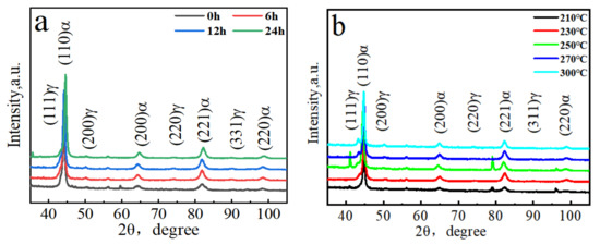 The diffraction patterns measured by XRD are shown in Figure 3. It can be seen from the diffraction patterns that as the isothermal time increases, the intensity of the γ diffraction peak gradually weakens, and it can be inferred that Vγ is gradually decreasing. Substituting the relevant information of the diffraction patterns into Formulas (1) and (2), Vγ is calculated and shown in Table 2. The experimental data show that the percentage of retained austenite after different heat-treated processes hardly exceeds 19%, and with the extension of isothermal time, Vγ gradually decreases. With increasing isothermal time, the bainitic nucleation point and the transformation amount of bainite increase gradually, leading to Vγ reducing by degrees.