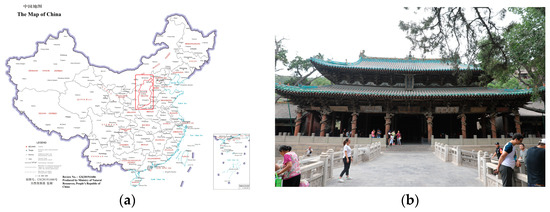 (a) Location of Shanxi province within China; (b) exterior view of the Sage Mother Hall.