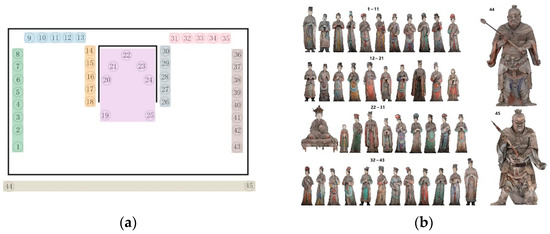 The statues in the hall serve as objects of worship, ritual, and veneration, while the building serves as a venue for religious events and as a home to these polychrome statues. The Sage Mother Hall contains 45 statues in all, including 43 inside the hall and 2 outside. Outside the temple, there are statues of the General of the Temple on both sides of the main corridor; the northern statue is an original Song Dynasty statue, and the southern statue is from the 1950s. Most of the statues depict maids from the Song dynasty, and the layout is reflected not only in the relationship between the statues and the building space but also in the arrangement and configuration of the statues, as well as differences in the size between the statues. The maids are positioned in front of the main statue shrine, as well as on the left and right sides, according to responsibility, status and rank. Additionally, the statues are organized and distributed in a “concave (凹)” shape to create a clustering effect. Each statue in the temple, with the exception of the main statue, is larger than the last. Highlighting the importance of the main statue, the others are designed to look like ordinary people. This reflects the secularized and realistic qualities of Song Dynasty designs. The distribution and a group image of the polychrome statues of the Sage Mother Hall of Jinci Temple can be found in Figure 2a,b, respectively.
