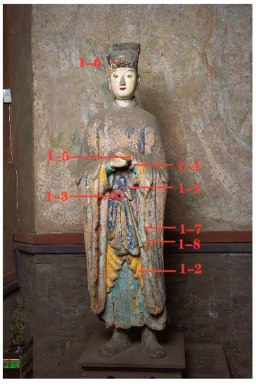 As can be seen through the remnants of several polychrome statues, the construction of a polychrome statue consists of a support body (wooden skeletons), a plaster layer (composed of a coarse clay layer and a fine clay layer) and a pigment layer. This study used a combination of nondestructive testing analyses and onsite sampling/laboratory analyses, with samples taken from the pigment and plasters of the polychrome statues in The Sage Mother Hall (No.CS1) in order to reduce the damage to the information contained within the polychrome statues. This was due to the importance and special characteristics of the polychrome statues in the Sage Mother Hall. At the same time, multiple analysis methods were combined in order to obtain data that were more scientific and rigorous. The sampling information is shown in Table 1, and Figure 3 provides information regarding the locations.