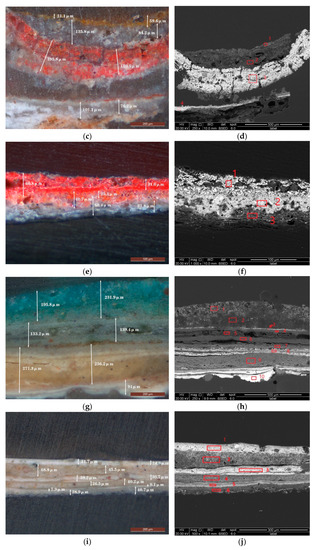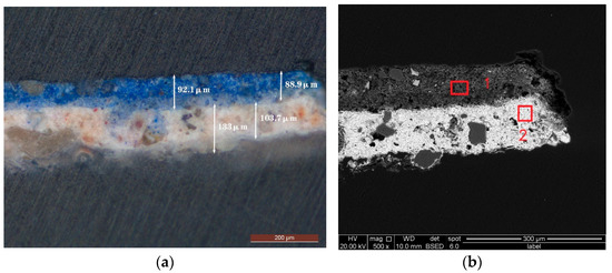 The cross-sections observed under the optical and scanning electron microscope clearly show that the structure of the painted sculpture is composed of three layers: a plaster layer, a white substrate layer, and a pigment layer. Most pigment samples have overlap layers and multilayers. OM and BSE images of the sample cross-sections are shown in Figure 5. The results of the SEM–EDS of the samples are listed in Table 3.