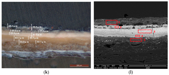 OM and BSE images of the sample cross-sections revealing paint stratigraphy. (a) OM images of 1-1 blue sample; (b) BSE images of 1-1 blue sample; (c) OM images of 1-2 yellow sample; (d) BSE images of 1-2 yellow sample; (e) OM images of 1-3 red sample; (f) BSE images of 1-3 red sample; (g) OM images of 1-4 green sample; (h) BSE images of 1-4 green sample; (i) OM images of 1-5 white sample; (j) BSE images of 1-5 white sample; (k) OM images of 1-6 black sample; (l) BSE images of 1-6 black sample.