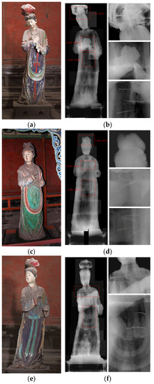 Visible and X-ray images of the polychrome statues. (a,c,e) CS27, CS29, CS30, visible light photographs; (b,d,f) CS27, CS29, CS30, X-radiographic images.