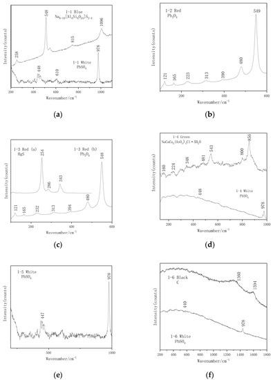 Sample 1-1 (Figure 7a) has L1 mineral Raman characteristic bands at 258 w, 548 vs and 1096 m cm−1, which are completely consistent with the characteristic bands of ultramarine. In Sample 1-2 (Figure 7b), an L1 surface yellow pigment layer was not detected, but it does have L3 mineral Raman characteristic bands at 121 vs, 223 w, 313 vw, 390 w and 549 vs cm−1, which are completely consistent with the characteristic bands of minium. Sample 1-3 (Figure 7c) has L1 mineral Raman characteristic bands at 254 vs, 286 w and 343 m cm−1, which are completely consistent with the characteristic bands of cinnabar; it also had L2 mineral Raman characteristic bands at 121 vs, 232 w(sh), 313 vw, 394 w, 480 vw and 548 vs cm−1, which are completely consistent with the characteristic bands of minium. The characteristic bands of the particles in Sample 1-4 (Figure 7d) were detected at 160, 224, 348, 543 and 856 cm−1 and are completely consistent with the characteristic bands of lavendulan. The spectra consist of v1 (AsO4) at 854, ν2 at 345 and ν4 at 545 cm−1 [12]. Sample 1-5 (Figure 7e) has L1 mineral Raman characteristic bands at 447 m and 978 s cm−1, which are completely consistent with the characteristic bands of lead sulfate, as well as other white pigments. Sample 1-6 (Figure 7f) has L1 mineral Raman characteristic bands at 961 m (=n1(a1) PO43-), ~1325 vs. (br) and ~1580 vs. (br), which are completely consistent with the characteristic bands of black carbon.