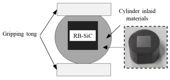The RB-SiC ceramic sample with dimensions of 10 mm × 10 mm × 3 mm is selected as the target and the major material properties of RB-SiC ceramics are given in Table 1. In order to guarantee the scratching stability of these samples in the experiment it is necessary to make the inlaid treatment for them, as shown in Figure 1, where the sample is embedded into the cylinder inlaid materials that is fixed by the gripping tong during the scratching process. After the inlaid treatment of the sample, the surface of the sample was first lapped parallel to the surface of the cylinder inlaid materials with P2400 sandpaper, and then it was polished by using the diamond slurry with concentration of 10% by mass and diameters of 2.5 μm and 1 μm, respectively, to realize the surface roughness of about 200 nm, which facilitates for further observation and analysis.