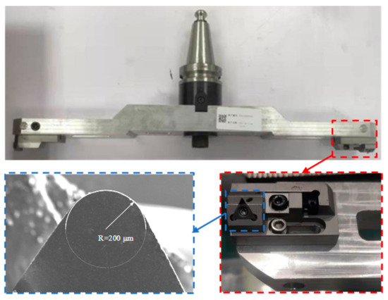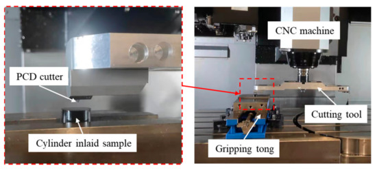 The experimental setup for the single abrasive scratching of RB-SiC ceramics is presented in Figure 2, where the specialized design cutting tool was connected to the spindle of the VMX42SRTi (Hurco Companies Inc., Indianapolis, IN, USA) CNC machine with the maximum spindle speed of 12,000 r/min and the cylinder inlaid sample was put just under the PCD cutter and fixed by the gripping tong. Then, the micrometer was employed to adjust the gripping tong to make it parallel to the working platform for ensuring the accuracy of the experiment.
