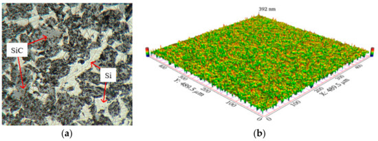 The overall surface morphology of the original RB-SiC ceramic sample after the precision abrasive polishing process can be seen in Figure 4, where the SiC and Si grains can be clearly found on the sample surface (see Figure 4a) and a good surface finish with the roughness of about 200 nm can be measured from Figure 4b, so that by using this kind of sample it facilitates the further distinguishing of the scratched sample surface with different material removal mechanisms. Due to the high hardness and brittleness of RB-SiC ceramic, it presents the typical brittle dominated material removal mode, such as the transgranular and intergranular cracks, as compared with the metals during the machining process [19,20]. However, by properly controlling the machining parameters the ductile material removal from RB-SiC ceramics with good surface finish can also be realized and the single abrasive scratching test is considered as one of the effective ways to investigate this phenomenon and to provide good references for the machining process.