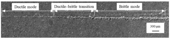 Figure 5 shows the typical surface morphology of the gradually increasing scratched RB-SiC ceramic sample from dc = 0 to dc = 30 μm at vs = 10 m/s and three material removal stages can be distinguished with respect to different underlying material removal mechanisms. In the ductile material removal stage, it can be seen from Figure 5 that a shallow scratched groove is left on the target surface and the surface of the groove seems to be smooth. Like the material removal from metals, RB-SiC ceramics are removed by plastic flow in this ductile material removal stage. To be specific, some materials can generate continuous thin chips in front of the rake face of the cutter and others can accumulate on both sides of the scratched groove to form plastic uplift such that there is almost no damage on the target surface [21,22]. After entering into the ductile–brittle transition material removal stage, the brittle material removal mode, like cracks, begins to dominate the material removal process, which results in the decrease of the smoothness on the scratched target surface. With the further increase of the scratching depth, it goes into the brittle material removal stage, where the width of the scratched groove significantly increases and there are obvious brittle fractures at the edge of the scratched groove caused by the grain spalling and fragmentation. Thus, in order to further analyze the material removal mechanisms in different stages, the surface integrity under different scratching speeds has been observed and compared, as explained in Section 3.2.