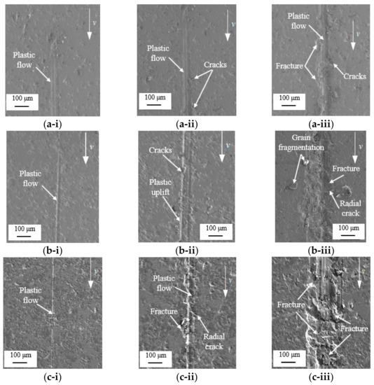 The surface integrity at different material removal stages with corresponding scratching speeds can be evaluated by distinguishing the surface morphologies of the scratched RB-SiC ceramic samples, as shown in Figure 6.