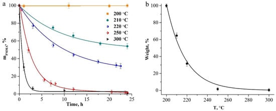 To estimate the initial sizes of the polymer and hybrid particles, we estimated the heating temperature of the core-shell particles under the action of the electron beam. For this purpose, we compared the maximum compression of such particles when exposed to an electron beam of different intensities and under their heating in the furnace. At low-current density (2 pA/cm2), a decrease in the outer diameter of the particles was ~5% (Figure 2b). At a current density of 10 pA/cm2, the maximum compression of the particles reached ~12% (Figure 2c). When comparing these data with the data on the heat treatment of hybrid particles in a wide temperature range (100–900 °C, see Figure 5a in [29]), we assume that the temperature of the core-shell particles under exposure under a low-intensity electron beam does not exceed 150 °C, and at a high-current density it does not exceed 200 °C. At these temperatures, the loss of polymer-core mass does not occur. The thermal-stability studies of the compacts of close-packed spherical PMMA particles at temperatures of 200–300 °C, for 24 h in the air (Figure 3), showed that no weight loss of polymer particles was observed upon heating up to 200 °C inclusive. At temperatures above 200 °C, the beginning of the depolymerization of PMMA particles was observed. When heating the compacts of polymer particles above 200 °C, a gradual increase in the mass-loss rate of the samples occurs, and at 300 °C, the sample evaporates almost completely in 5 h (Figure 3a). Figure 3b illustrates a change in the weight of the compacts with the heating temperature for 24 h. The experimental values of the weight loss (Figure 3a,b) are described well by exponential functions with the coefficient of determination R2 = 0.99 for each curve.