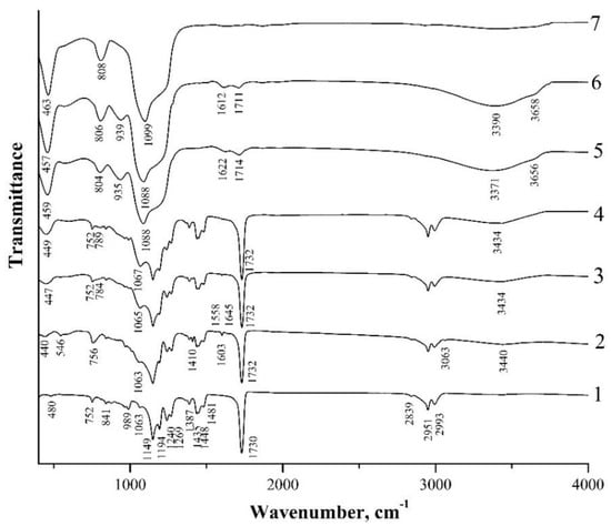 IR transmission spectra of spherical PMMA particles (1), initial hybrid core-shell particles obtained using ammonium hydroxide (type I particles) (2), and annealed at 150 °C (3), 200 °C (4), 300 °C (5), 400 °C (6) and 600 °C (7).
