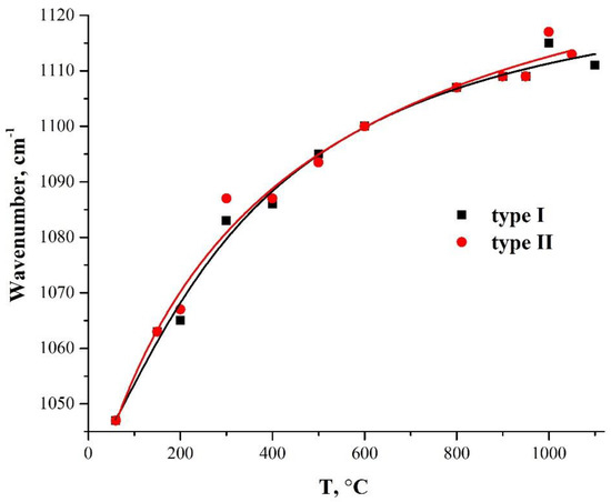 Figure 6 shows the dependencies of the TO3-mode oscillation frequency in two types of PMMA-SiO2 hybrid particles on their annealing temperature. Both samples exhibit a smooth increase in the frequency of TO3 oscillations with an increasing annealing temperature, which is due to the densification of the silica-shell structure [40,42,45,46]. This character of the temperature dependence of the vibrational mode of the Si–O–Si bonds indicates the microstructural homogeneity of the synthesized-silica shell.