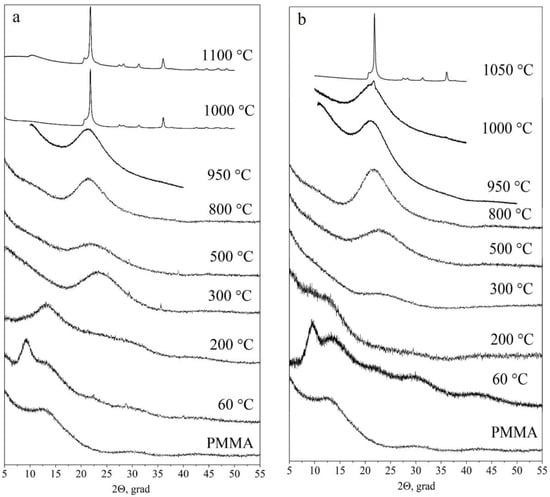 Figure 7 shows X-ray diffraction patterns of initial polymer particles (used as cores) and PMMA-SiO2-hybrid particles of type I (a) and type II (b) annealed at 200 °C, 300 °C, 500 °C, 800 °C, 950 °C, 1000 °C, and 1100 °C and 200 °C, 300 °C, 500 °C, 800 °C, 950 °C, 1000 °C, and 1050 °C, respectively. The X-ray diffraction pattern of the polymer is a series of wide bands, which is typical for an amorphous material, with the first small-angle peak clearly distinguished in the intensity at the 2θ angle of ~13.5° [47,48]. The shape of the first peak reflects the degree of polymer-chain ordering. At a qualitative level, the peak width can be used to estimate the degree of polymer amorphism. The smaller the peak width, the less randomly the macromolecular chains are arranged.