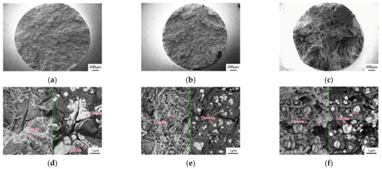 SEM images of fracture morphologies of DZ406 superalloy at a lower and higher magnification when tested at −125 °C (a,d), 25 °C (b,e) and 1000 °C (c,f).