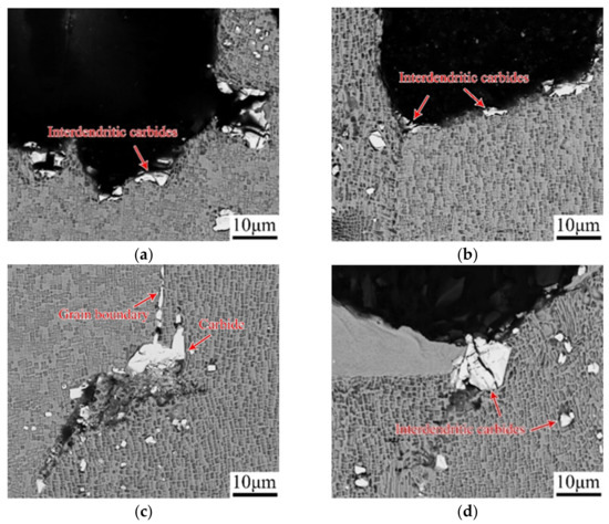 The fracture microstructures at the longitudinal sections were further observed to confirm the characteristics of tensile cracks distribution. Figure 3 are SEM-BSE images of a fracture microstructure at the longitudinal sections close to the fracture surface of DZ406 superalloy. The difference of thermal expansion between carbides and γ matrix lead to the stress concentration and interface cracking [18]. The tensile cracks were located at the interfaces of the carbides and γ matrix at −125 °C and room temperature, while the carbides suffered self-cracking at −125 °C, as shown in Figure 3a,b. However, a large number of cracks were found in the grain boundaries beside the interdendritic regions when tested at 1000 °C (Figure 3c,d). The above phenomenon showed that when the tensile temperature increased to 1000 °C, the strength of the grain boundary decreased, making both the interdendritic region and the grain boundary weak areas that are prone to initiating cracks. The grain boundary in Ni-based alloys plays a strengthening role at room temperature and low temperature, while it often becomes a weak region at high temperature [16]. For metal materials, the grain boundary strength is higher than that in the grain below the critical temperature, but the result is opposite above the critical temperature [16]. The fracture microstructures show that the critical temperature of the DZ406 alloy is between room temperature and 1000 °C, which leads to the fracture region of the DZ406 alloy located in the interdendritic region at room temperature and cryogenic temperature, while in both the grain boundary and interdendritic region at 1000 °C.