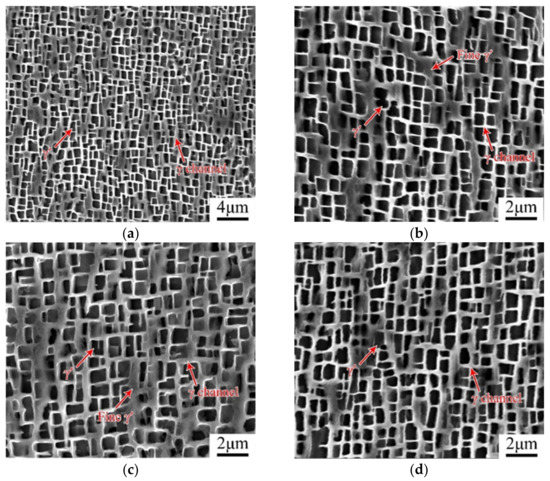 As the main reinforcing phase in cast Ni-based superalloys, the area fraction, distribution and size, and composition characterization of γ′ phase are crucial to the tensile property [8,15,18]. Thus, the microstructures of the γ′ precipitates were systematically characterized and quantified in the tensile samples. The SEM-SE images in Figure 4 show the morphologies of γ′ precipitates in the dendrite core regions at the longitudinal sections close to the fracture surface of the tensile rupture specimens of the DZ406 superalloy. Figure 4a,b show the morphologies of γ′ precipitates at a tensile temperature of −125 °C at a low magnification and high magnification, respectively. The γ′ phase maintained a good cuboidal morphology and fine γ′ particles still existed in the γ channel. The morphology of the γ′ phase was basically consistent with that after the standard solution treatment. At room temperature, the morphology of the γ′ phase was basically consistent with that at −125 °C, as shown in Figure 4c. When the temperature rose to 1000 °C, the γ′ phase still basically maintained a cuboidal shape, but due to the relatively high tensile temperature, the small γ′ particles in the γ channel dissolved (Figure 4d). Overall, due to the low testing temperature and short duration of the tensile testing process, microstructural degradation of the γ′ precipitates was basically negligible.