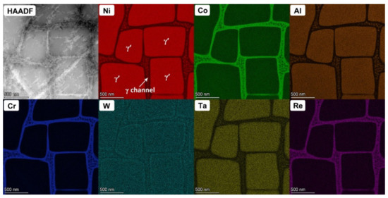 Element distribution between γ and γ′ phases is important to the strengthening effect of γ′ precipitates [19,20,21], thus the chemical compositions of the above two phases were measured using STEM-EDX at different testing temperatures. Figure 5 depicts the element mapping of the γ matrix and γ′ precipitates in the cross sections that are close to the fracture surface of the DZ406 superalloy tested at −125 °C. The γ phase was enriched in Co, Cr and Re, while the γ′ phase was enriched in Ni, Al, W and Ta. It is worth noting that the composition characteristics of γ and γ′ phases were consistent at −125 °C, room temperature and 1000 °C.