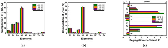 - The secondary γ′ precipitates in the dendrite core regions basically maintained a cuboidal shape and suffered negligible degradation when tested from −125 °C to 1000 °C. The γ phase was rich in Co, Cr and Re, and the γ′ phase was rich in Ni, Al, W and Ta. The chemical compositions of the γ phase and γ′ phases, as well as the element segregation between the γ/γ′ phases were close at different testing temperatures from −125 °C to 1000 °C;