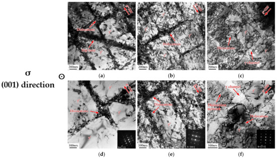 Figure 7b,e show the dislocation configurations in the dendrite cores at the cross sections that are close to the fracture surface of the DZ406 superalloy that was tested at room temperature. A large number of dislocations had been cut in the γ′ phase. In addition, the width of the stacking fault decreased, indicating the increased stacking fault energy, thus the dislocations were easier to cross-slip. At 1000 °C, the sub-microstructure morphology changed obviously, the length of dislocation increased significantly and a dislocation network formed at the interface of γ/γ′ phases; more dislocations had been cut in the γ′ precipitates (Figure 7c,f), compared to that at room temperature (Figure 7b,e). The dislocation density in the γ channel decreased significantly, and the dislocations accumulated at the γ/γ′ interfaces and partially formed the dislocation networks. Different from cryogenic temperatures and room temperature, the γ′ phase was cut in the form of dislocations because of its high stacking fault energy at high temperature [23].